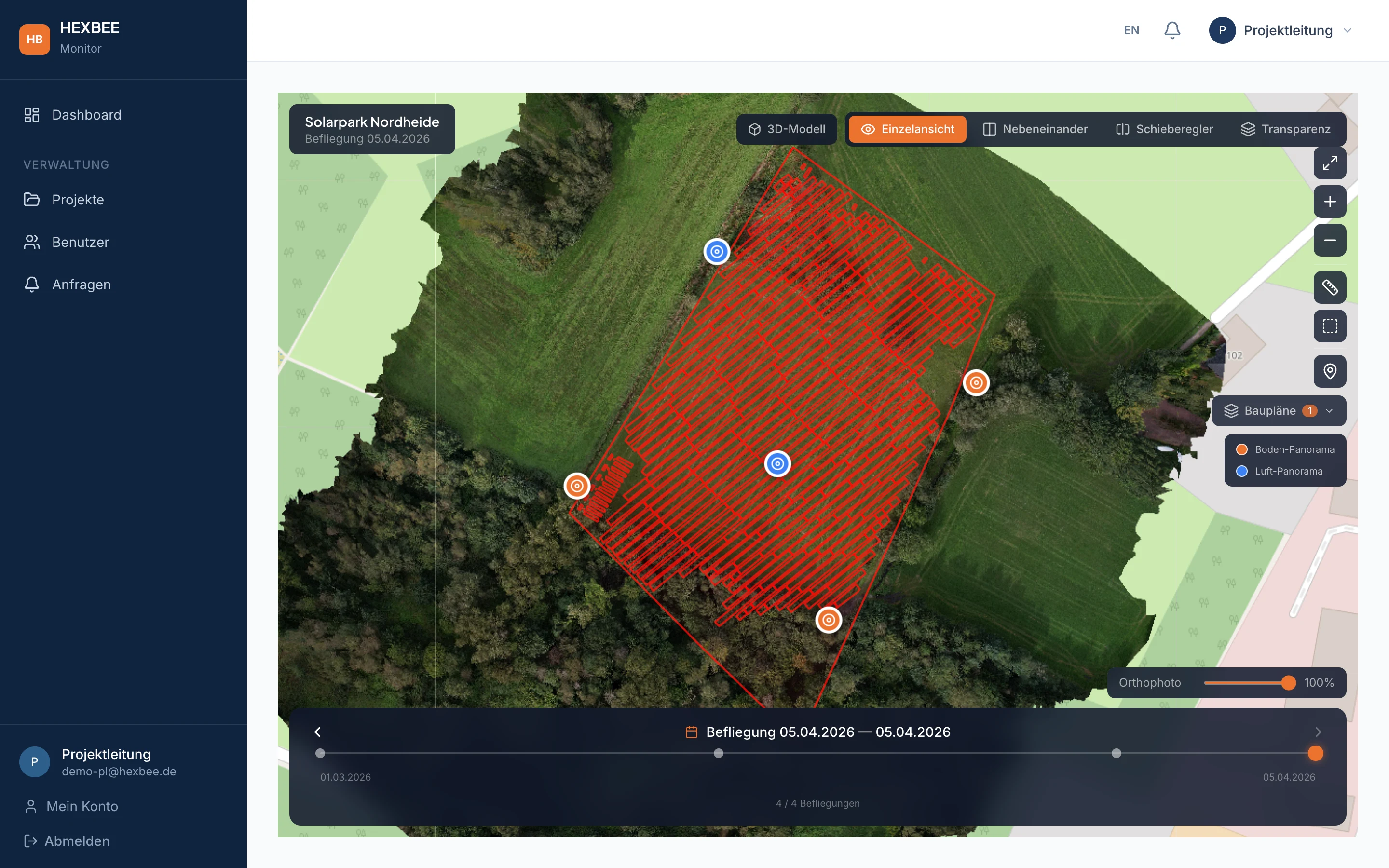 Orthofoto-Karten, 360°-Panoramen, Planvergleich und Zeitachse in einem Viewer. Wöchentlich aktualisiert, ohne Installation, DSGVO-konform auf deutschen Servern.